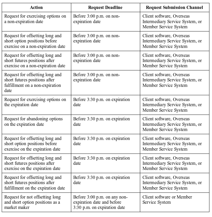Nickel options are American-style options. Non-Futures Firm Members (“Non-FF Members”), Overseas Special Non-Brokerage Participants (“OSNBPs”), and Clients should observe the following table on the timing and channel for performing various actions such as exercise and abandonment.