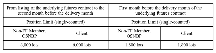 For the purposes of position limit, nickel option positions will not be aggregated with futures positions. For any Non-FF Member, OSNBP, or Client, the total size of long calls and short puts of any particular contract month, as well as the total size of long puts and short calls of any particular contract month, should in each case not exceed the position limit tabulated below. For the purposes of position limit, accounts linked by actual control relationship are treated as a single account.