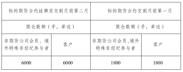 期权和标的期货分开限仓非期货公司会员境外特殊非经纪参与者和客户持有的某月份期权合约所有看涨期权的买持仓量和看跌期权的卖持仓量之和、看跌期权的买持仓量和看涨期权的卖持仓量之和,分别不得超过下表所示的持仓限额。具有实际控制关系的账户按照同一账户管理。