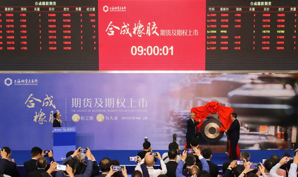 中国证监会期货监管部张博宣读中国证监会《关于同意上海期货交易所合成橡胶期货及期权注册的批复》。上海市地方金融监督管理局副局长黄振球,中国石油和化学工业联合会副会长兼秘书长赵俊贵,中国石油天然气股份有限公司炼油化工和新材料分公司高级副总经理何盛宝,中国石化化工销售有限公司副总经理李锁山,上期所理事长田向阳先后致辞。上期所总经理王凤海主持上市活动。